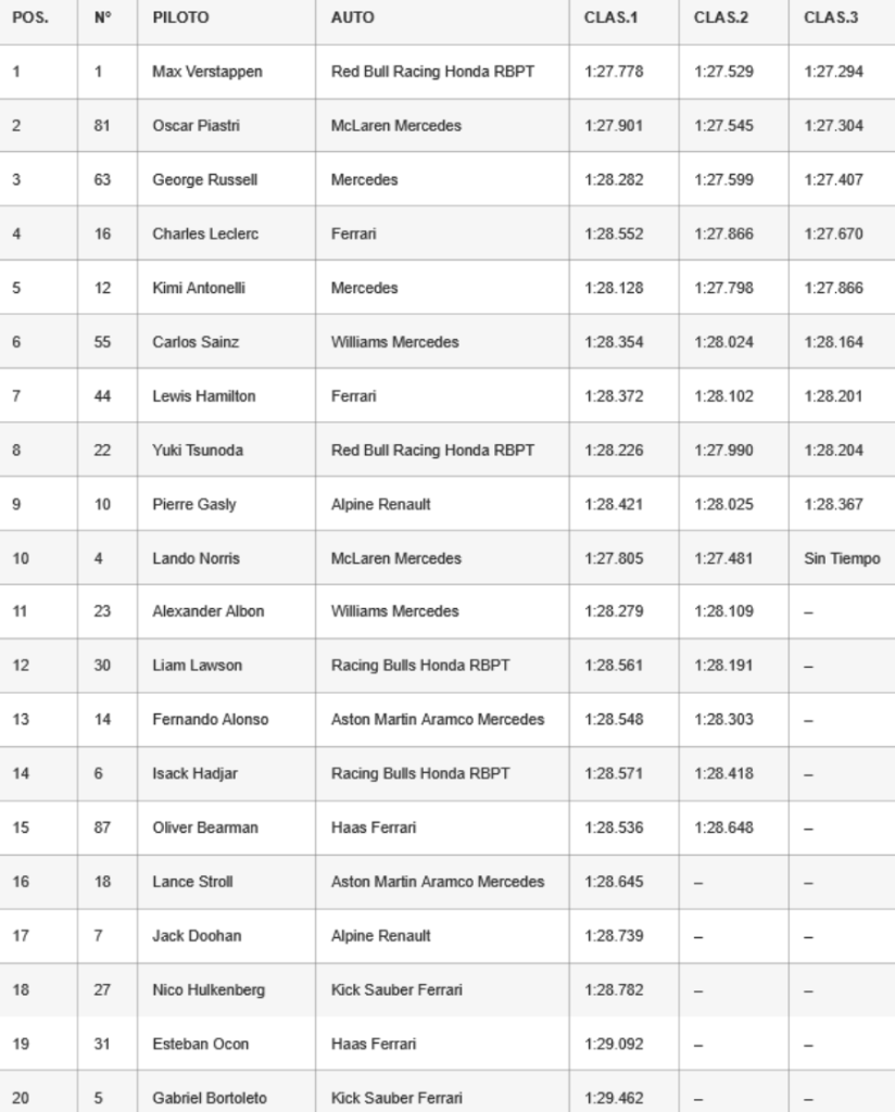 La tercera posición le correspondió al Mercedes de George Russell, quien clasificó a 113 milésimas, seguido por la Ferrari de Charles Leclerc quien quedó a 0s376 filtrándose entre las «flecha de plata» del británico y su compañero Andrea Kimi Antonelli, que se ubicó a 0s572.