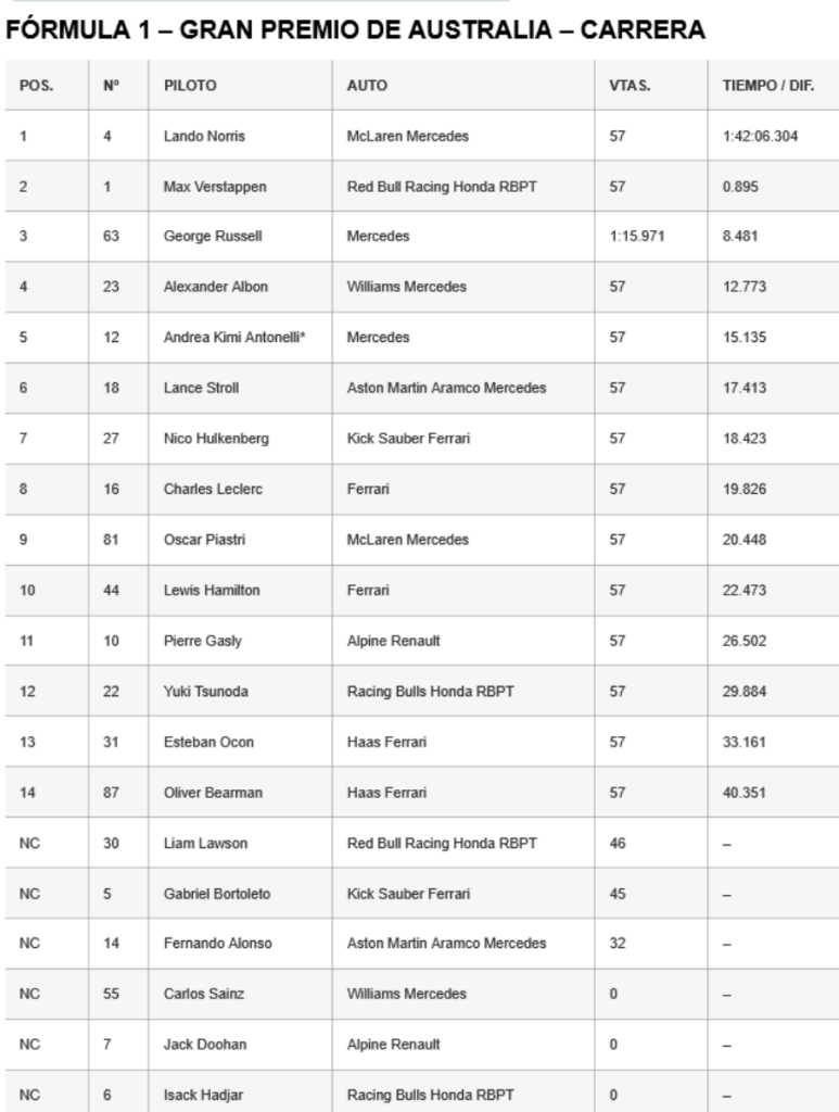 La apertura del campeonato mundial de Fórmula 1 se vio en el Gran Premio de Australia que se disputó en el Circuito "Albert Park" de Melbourne, tuvo un vibrante espectáculo durante 1h50m que duró la prueba y en donde el ganador fue Lando Norris con el McLaren y quien consiguió prevalecer con el MCL39 tras recuperarse de un leve despiste en el giro 44, junto a su compañero el australiano Oscar Piastri, quien quedó atrapado en la banquina y perdió casi una vuelta en tratar de retomar la marcha.
