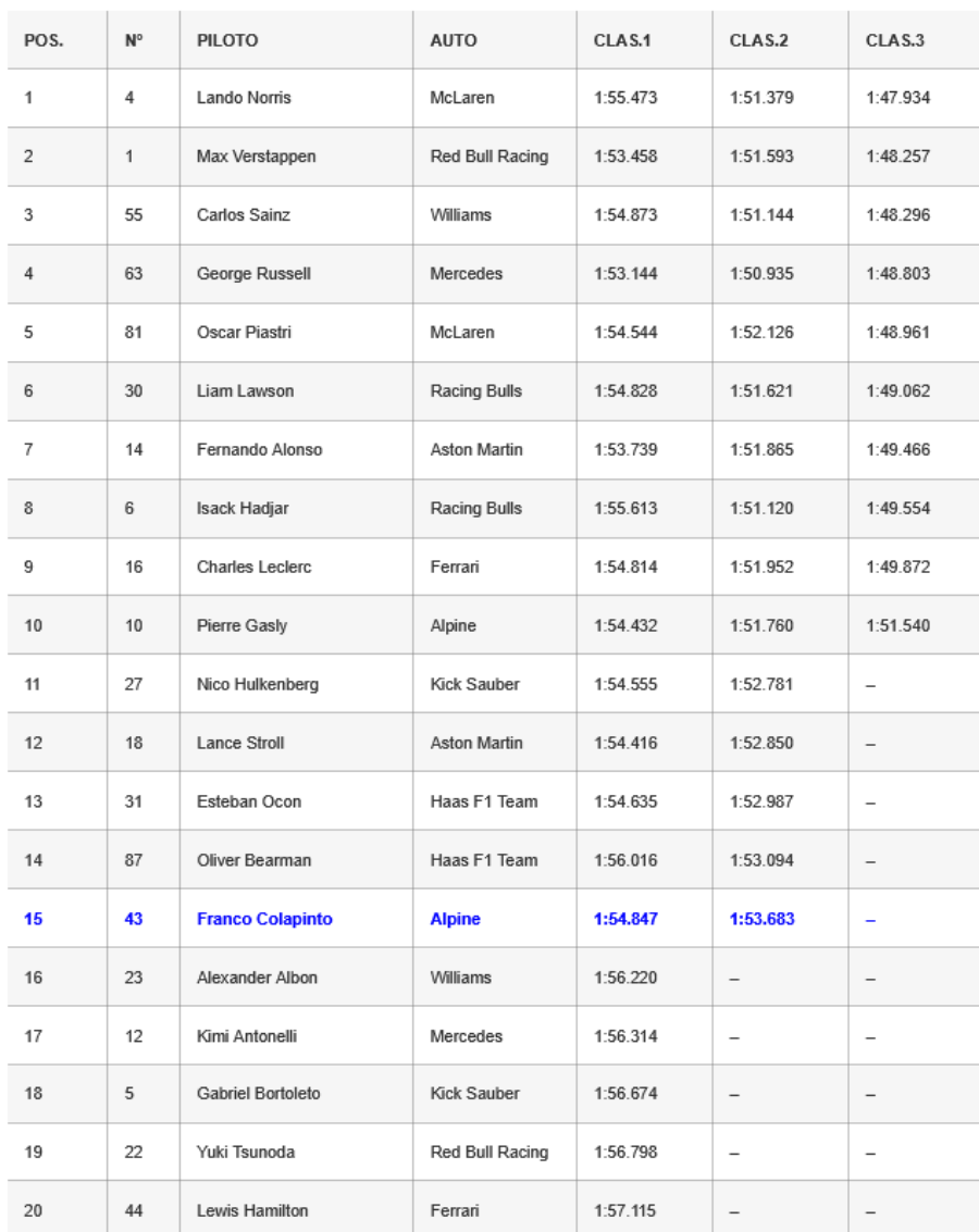 Conduciendo su McLaren MCL39 con la punta de los dedos, y dosificando la potencia del motor para evitar excederse en los virages cuando pisaba en los sectores mojados, quien lidera el campeonato, Lando Norris consiguió ser el mejor de la clasificación sobre el cierre de la tanda y recibiendo la bandera de cuadros al mismo tiempo que hacía 1m47s934 (a 206,826 Km/h.) y desplazando de la primera posición al Red Bull de Max Verstappen por 0s323. El británico celebra este fin de semana su 150 Grand Prix y lo hizo marcando la 16ª «pole position» en F1, y la tercera consecutiva.