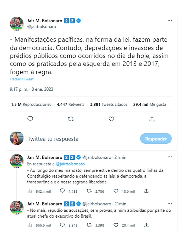 Más de siete horas después de los violentos ataques a los edificios de Gobierno en Brasilia, cuando cientos de simpatizantes suyos invadieron el Congreso, el Palacio Presidencial y la Corte Suprema, el exmandatario Jair Bolsonaro se pronunció.