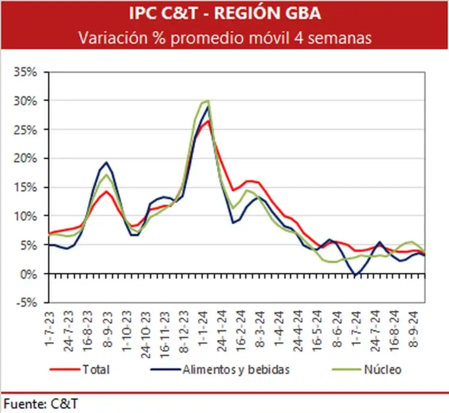 Por su parte, desde C&T, para su medición del Gran Buenos Aires (GBA), estimaron que los precios minoristas presentaron un alza de 3,5% en Septiembre, con una núcleo en el 3,8%, por debajo del 4,8% de Agosto y el 4,3% del relevamiento del Instituto Nacional de Estadísticas y Censos (INDEC).