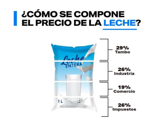Al momento de medir el precio en góndola de la leche, el tambo explica el 29% de los costos, la industria e impuestos un 26% cada uno y el comercio un 19%. En paralelo, de los impuestos que paga la cadena de valor, un 79,5% son nacionales, un 16,2% provinciales y e, 4,3% corresponde a los municipales.