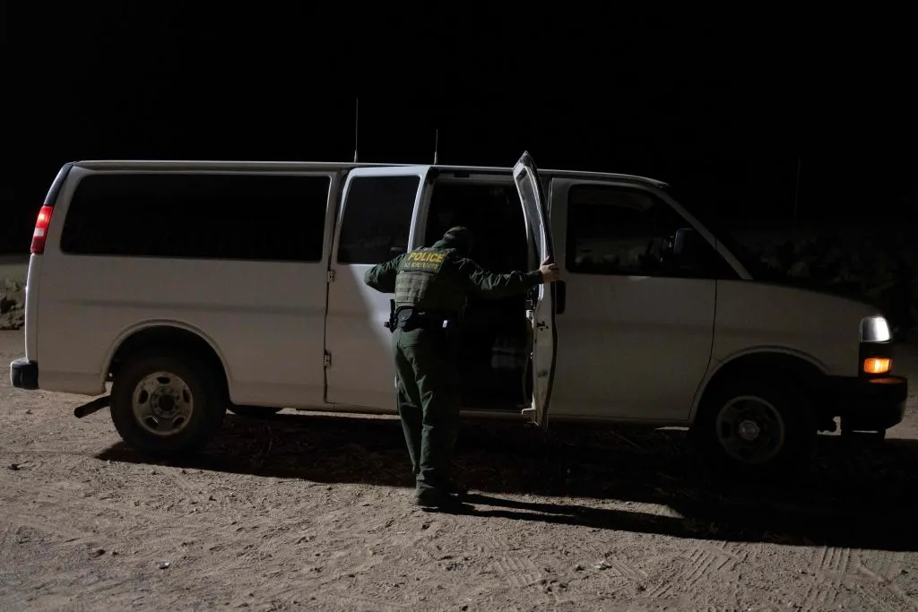 Un agente de la Patrulla Fronteriza de EE.UU. cierra las puertas de una camioneta que transportaba solicitantes de asilo en la valla fronteriza entre EE.UU. y México cerca de Somerton, Arizona, el 26 de Diciembre de 2022. (Crédito: Rebecca Noble/AFP via Getty Images)