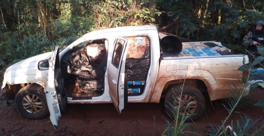 Las tareas de rastrillaje permitieron hallar a uno de los vehículos sobre un camino secundario, sin ocupantes, y con un total de 19.600 paquetes de cigarrillos de origen extranjero sin aval aduanero.