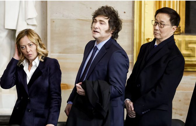 Giorgia Meloni, Javier Milei, y el Vicepresidente de China, Han Zheng - reemplazó a Xi -, durante la ceremonia de asunción de Trump, (Washington, Estados Unidos)