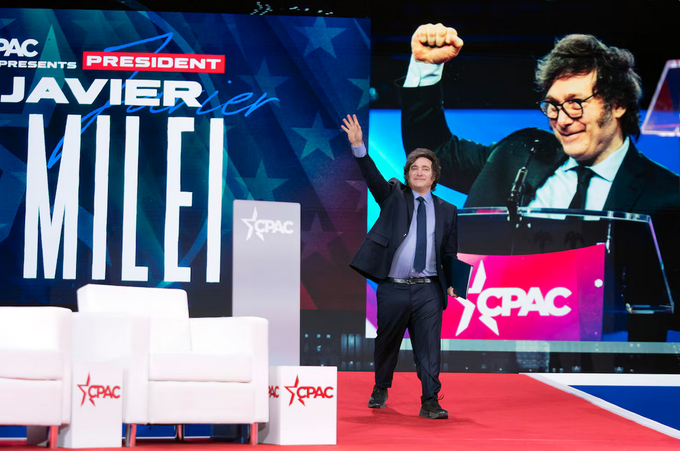 Javier Milei saluda al público antes de hablar en la Conferencia de Acción Política Conservadora (CPAC), que deliberó en Maryland (Estados Unidos)