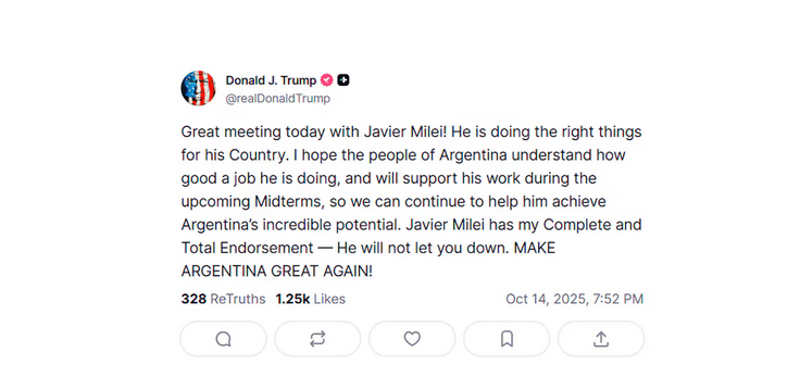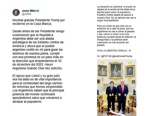 “¡Hoy he tenido una reunión estupenda con Javier Milei! Está haciendo lo correcto por su país. Espero que el pueblo argentino comprenda lo bien que está haciendo su trabajo y le apoye en las próximas elecciones de mitad de mandato, para que podamos seguir ayudándole a alcanzar el increíble potencial de Argentina", dijo el mandatario estadounidense.