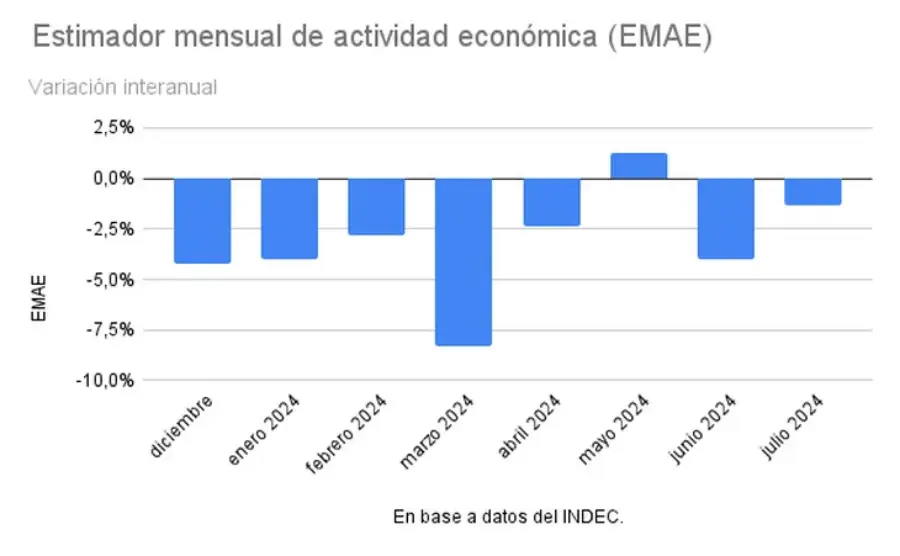 n lo que va del Gobierno del Presidente Javier Milei, entre diciembre y julio, solo en mayo el EMAE exhibió un alza interanual, mientras que en los demás meses las bajas oscilaron entre el pico de 8,3% en Marzo y el 1,3% de Julio.