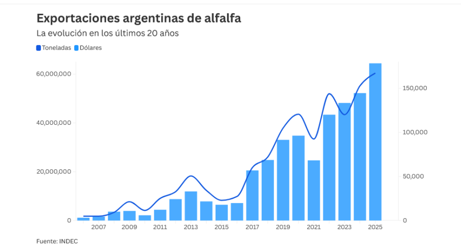 En 2025, las exportaciones de alfalfa fueron las mayores de la historia tanto en volumen como en dólares.
