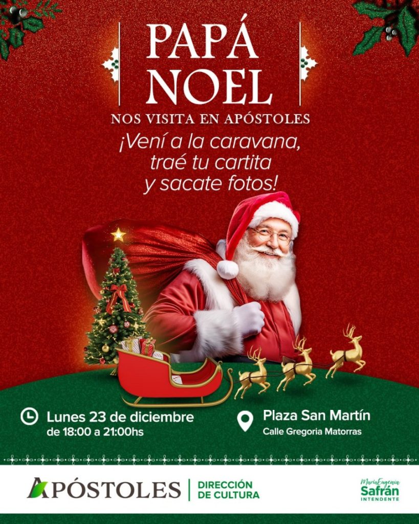 La Municipalidad de la ciudad misionera de Apóstoles, a través de la Dirección de Cultura, ha organizado una serie de actividades para celebrar la Navidad 2024 en la ciudad. En este sentido, se ha programado la Caravana de Papá Noel, que se llevará a cabo este lunes 23 de Diciembre.