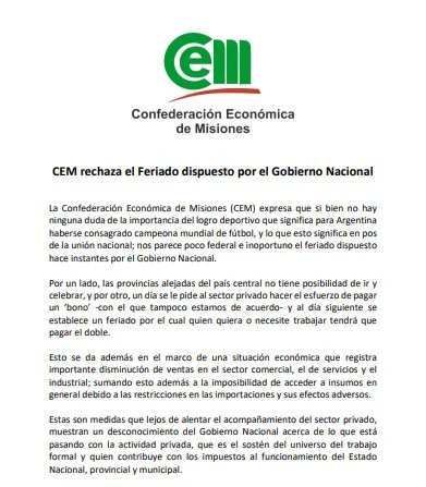 La Confederación Económica de Misiones (CEM) expresa que si bien no hay ninguna duda de la importancia del logro deportivo que significa para Argentina haberse consagrado campeona mundial de fútbol, y lo que esto significa en pos de la unión nacional; nos parece poco federal e inoportuno el feriado dispuesto hace instantes por el Gobierno Nacional.