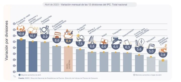 Según el informe del INDEC, el mayor aumento fue en el segmento "Prendas de vestir y Calzado", donde trepó al 10,8%. Siguió "Alimentos y bebidas no alcohólicas" con el 10,1%, donde marcaron los picos verduras, tubérculos y legumbres, leche, productos lácteos y huevos, azúcar, dulces, chocolates, golosinas, y carnes y derivados.