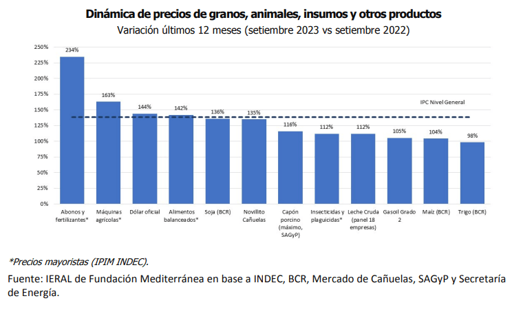 “En lo que hace a los insumos, y dada la información que se dispone, los precios mayoristas de abonos y fertilizantes muestran una gran aceleración en los últimos 12 meses, una tasa de inflación del 234% que más que duplica la de los granos, otros productos e insumos agropecuarios”, menciona el estudio.