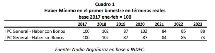 Con bonos, la situación refleja mejoras, obviamente, en los periodos en que se otorgaron. Es decir en 2020 y en este año 2023. En efecto, la caída del poder adquisitivo de un jubilado se reduce desde el 27% sin bonos al 12% con bonos, siempre comparando con 2017.