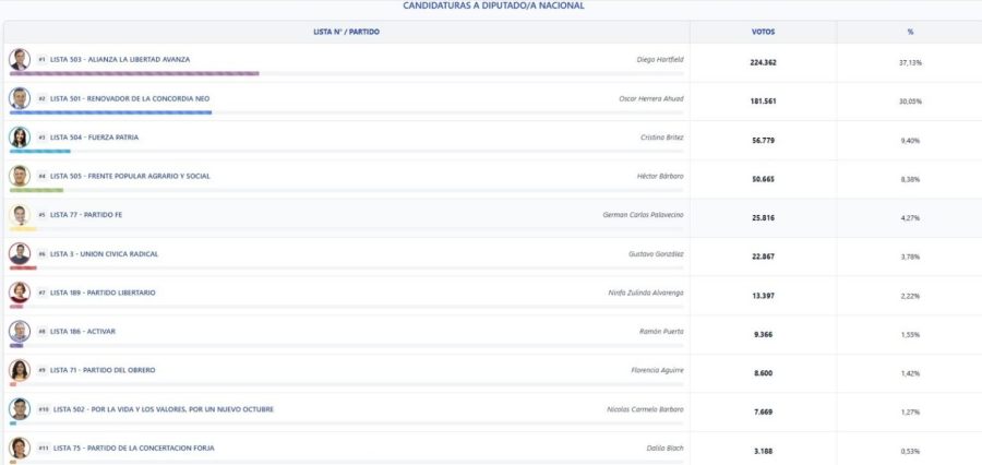 En Misiones votaron en estos comicios 628.261 ciudadanos, lo que representa el 62,43% del padrón. De ese total, 224.362 sufragios fueron para la lista libertaria, 181.561 para la Renovación y 56.779 para Fuerza Patria.
