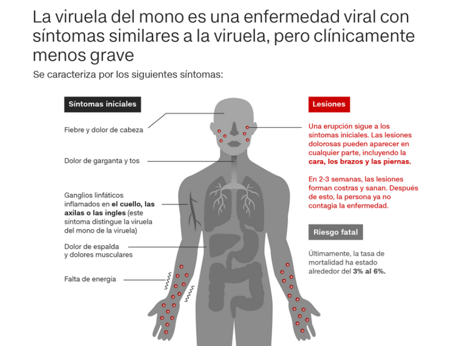 La mpox, antes conocida como viruela del mono, es una enfermedad viral que puede propagarse fácilmente entre personas y a partir de animales infectados. Puede propagarse a través del contacto cercano, como tocar, besar o tener relaciones sexuales, así como a través de materiales contaminados como sábanas, ropa y agujas, según la OMS. Los síntomas incluyen fiebre, sarpullido doloroso, dolor de cabeza, dolor muscular y de espalda, poca energía y ganglios linfáticos agrandados.