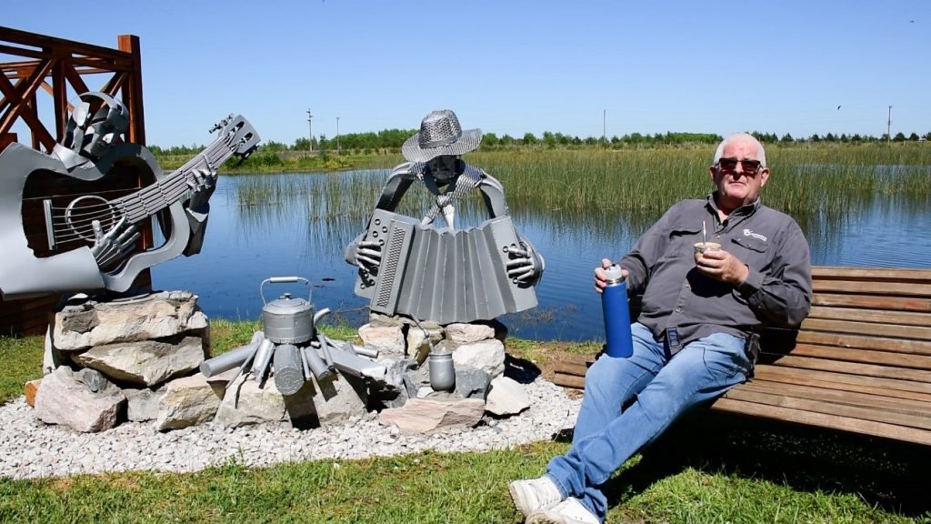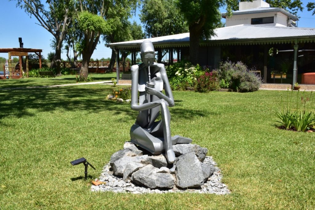 “Los Musiqueros y todos los murales que se encuentran aquí fueron encargadas al mismo artista que fue autor del monumento de Andresito Guacurarí emplazado en la Costanera de Posadas y El Matero del Paseo Bosetti”, señala Juan Carlos, dejando abierta una intriga que minutos después una de sus hijas develará al dar detalles de “La Matera de Bosquemar”, otra de las piezas relacionadas a la cultura matera que se encuentran en el predio; en este caso en el parque de la residencia familiar.