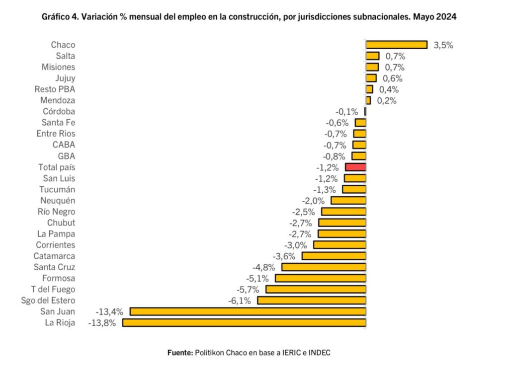 Según un informe presentado por la Consultora Politikon Chaco, señala que en el mes de mayo, el empleo registrado en el sector de la construcción consolidó su deterioro, marcando una caída en el nivel nacional del 22,5%. En este contexto, Misiones se posiciona entre las seis provincias que tuvieron incrementos moderados en el desempeño del empleo sectorial a nivel provincial con el 0,7%.
