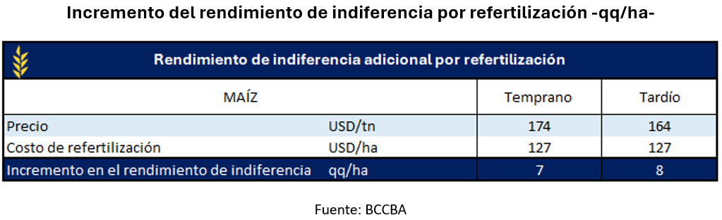En base a las rentabilidades estimadas, el impacto en precios y costos que podría implicar una buena campaña, acompañados por el contexto internacional bajista que transitan los precios de los granos, adquiere importancia el análisis del impacto en la rentabilidad de los productores que ciertas actividades podrían tener. Algunas de ellas habituales, como lo es la refertilización del maíz, que en otras circunstancias se realizaría por default pudieron verse analizadas más en detalle durante el presente ciclo productivo.