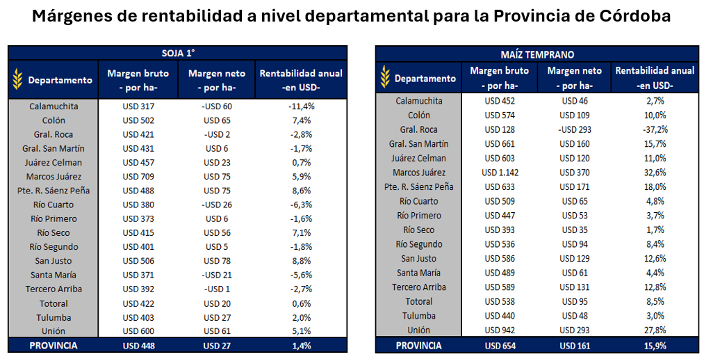 El maíz temprano tendría la mejor rentabilidad considerando los precios a los cuales se están negociando los contratos a futuro. Principalmente, las zonas con mayor proporción de siembras tempranas, son los departamentos de la zona núcleo, Unión y Marcos Juárez. Sin embargo, más del 80% de la producción cordobesa se siembra de manera tardía, cuya rentabilidad sería levemente negativa.