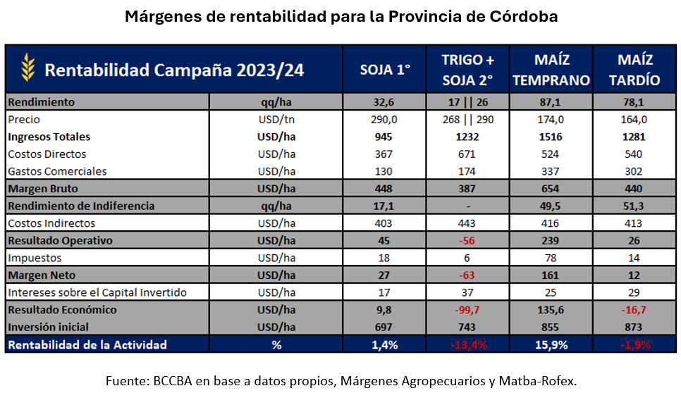 Teniendo presente el marco anterior, a continuación la Bolsa presenta estimaciones sobre la rentabilidad de los principales cultivos para Córdoba durante la campaña 2023/24.