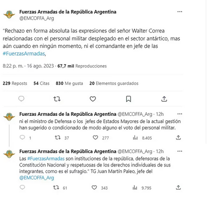 “Rechazo en forma absoluta las expresiones del señor Walter Correa relacionadas con el personal militar desplegado en el sector antártico, más aún cuando en ningún momento, ni el comandante en jefe de las Fuerzas Armadas, ni el Ministro de Defensa o los jefes de Estados Mayores de la actual gestión, han sugerido o condicionado de modo alguno el voto del personal militar”, señaló el Teniente General.