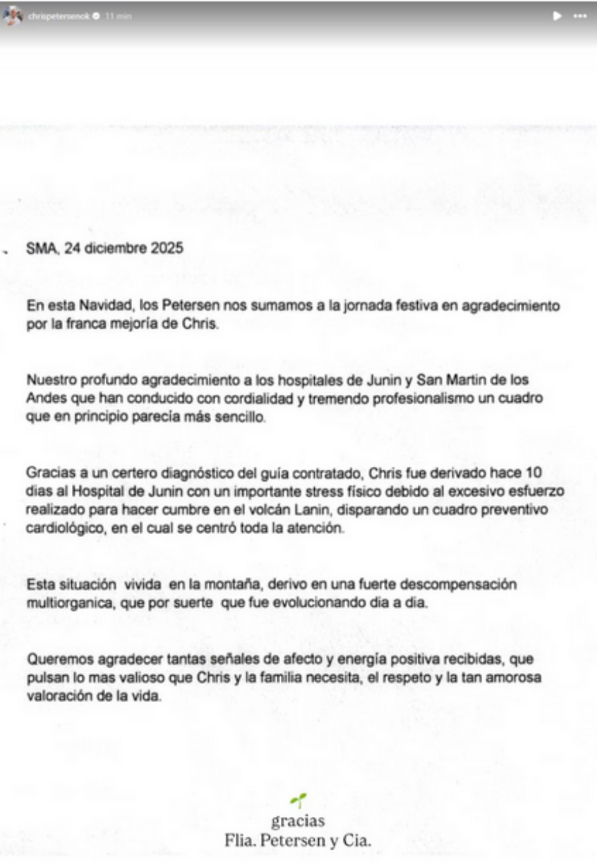 Previo a la Navidad, la familia del chef compartió un mensaje en redes sociales en el que agradeció la mejoría de Petersen y el accionar profesional del personal sanitario: “Nuestro profundo agradecimiento a los hospitales de Junín y San Martín de los Andes que han conducido con cordialidad y tremendo profesionalismo un cuadro que en principio parecía más sencillo”. Ese mismo período, su hermano Roberto Petersen valoró también la labor del equipo médico y el respaldo colectivo, destacando la fuerza de Chris y el apoyo recibido.