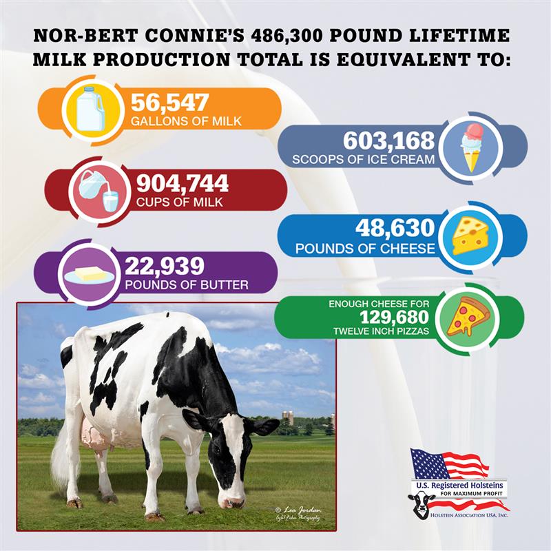Según Holstein USA, el récord total de producción de leche de 220.581 kilos de leche de Nor-Bert Colby Connie es equivalente a 214.053 litros de leche fluida, 904.744 tazas de leche, 22.058 kilos de queso, o la suficiente mozzarella para 130.000 pizzas tradicionales de Argentina (8 porciones), o más de 600 mil bochas de helado.