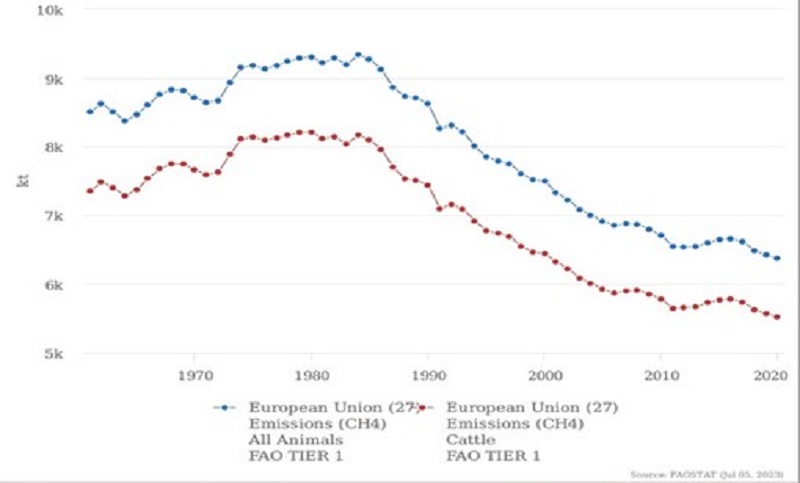 Por tanto, atendiendo no solo la captura de carbono, sino también las nuevas métricas propuestas por los físicos atmosféricos de Oxford y la FAO, que consideran al metano como un gas de ciclo corto y, por lo tanto, no medible en términos de CO2 equivalente (CO2 es un gas de ciclo largo); el sector rural de la UE (principalmente la ganadería), al reducir las emisiones de metano, en lugar de calentar la atmósfera en realidad contribuyó a enfriarla en un total de -2.900 millones de CO2 equivalente, una reducción comparable a (y que suma) un tercio de la lograda por la captura de carbono a través del suelo y la vegetación durante el mismo período.