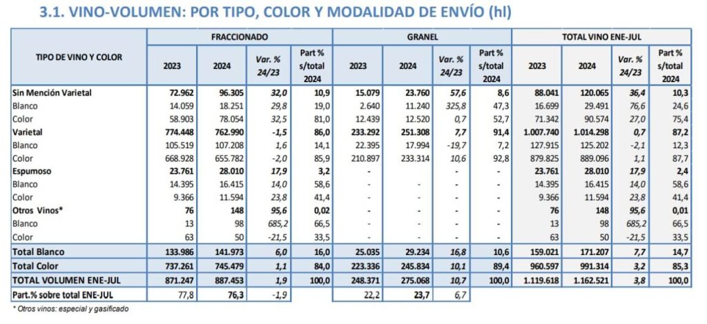 Además informaron que de ese total, unos 88,7 millones (76,3%) corresponden a “vinos fraccionados (+1,9%) y 27,5 millones (23,7%) son vinos a granel (10,7%)”.