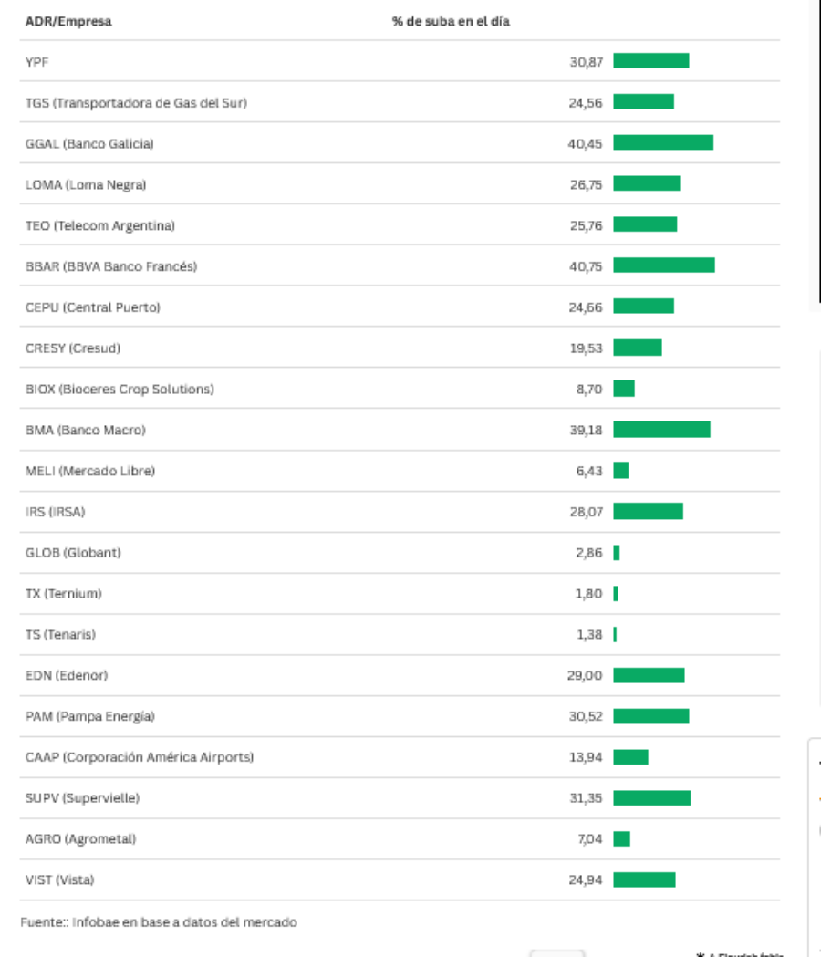 En Wall Street, las cotizaciones en dólares de acciones y bonos argentinos también se disparan.