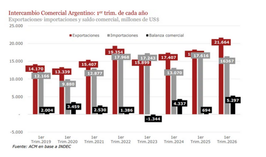 Hacia adelante, ACM pronosticó que las exportaciones superarán los 90.000 millones de dólares en 2026 (en el primer trimestre rozaron los 22.000 millones de dólares ), traccionadas principalmente por el complejo agroindustrial y un aporte creciente del sector energético. En cuanto a las importaciones, las ven aumentando a un menor ritmo que en 2025, para culminar el año en torno a los 80.000 millones de dólares (en el primer trimestre se ubicaron arriba de los 16.000 millones de dólares). "Resta ver en qué medida la recuperación de importaciones se concentra en bienes de capital e insumos (más que en consumo) y si se sostiene la competitividad necesaria para que el superávit proyectado se materialice", profundizó la entidad.