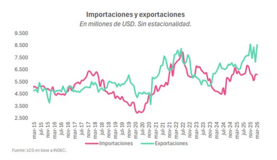 LCG estimó un superávit comercial similar para este año, por encima de los 10.000 millones de dólares, teniendo en cuenta la cosecha récord de maíz, el reciente aumento en el precio del petróleo por la guerra en Medio Oriente y la dinámica de una actividad económica que, por el momento, no da señales de un repunte considerable.