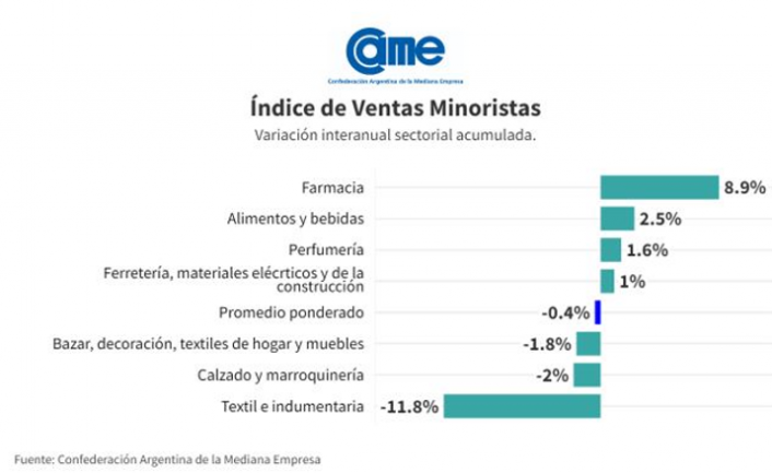 Así surge del Índice de Ventas Minoristas PyMEs de la Confederación Argentina de la Mediana Empresa (CAME), elaborado en base a su relevamiento mensual entre 1.184 comercios minoristas de todo el país, realizado entre el 3 y 5 de Abril.