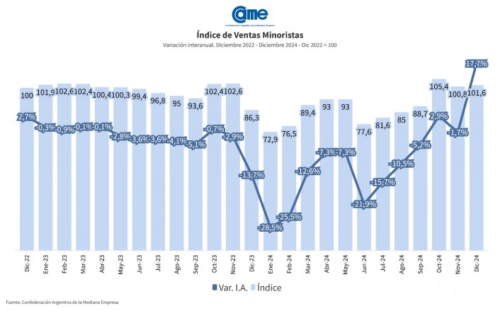 Así surge del Índice de Ventas Minoristas PyMEs de la Confederación Argentina de la en Mediana Empresa (CAME), elaborado en base a un relevamiento mensual entre 1.262 comercios minoristas del país, realizado entre el 2 y el 3 de Enero de 2025.