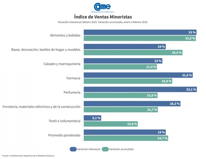 En Febrero, los siete rubros relevados registraron subas interanuales en sus ventas. El mayor incremento se detectó en Perfumería (+33,1%), seguido por Alimentos y Bebidas (+33%) y Farmacia (+31,9%). En el acumulado del bimestre, lidera Alimentos y Bebidas con un aumento de +32,8%.