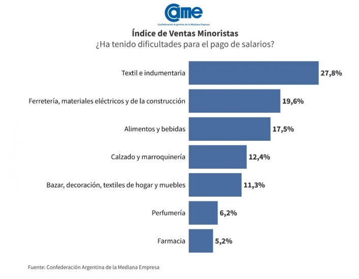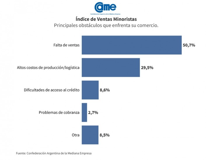 Así surge el Índice de Ventas Minoristas (IVM) PyMEs de la Confederación Argentina de la en Mediana Empresa (CAME), elaborado en base a un relevamiento mensual entre 1.209 comercios minoristas del país, realizado entre el 1 y 7 de Marzo.