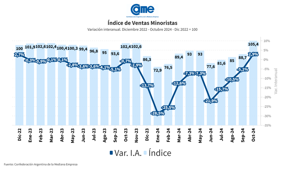Las ventas tuvieron un alza del 2,8%, a precios constantes, mientras la caída acumulada es del 14,1% en los primeros diez meses 2024, frente al año pasado. En la comparación intermensual, aumentaron 9,3%.