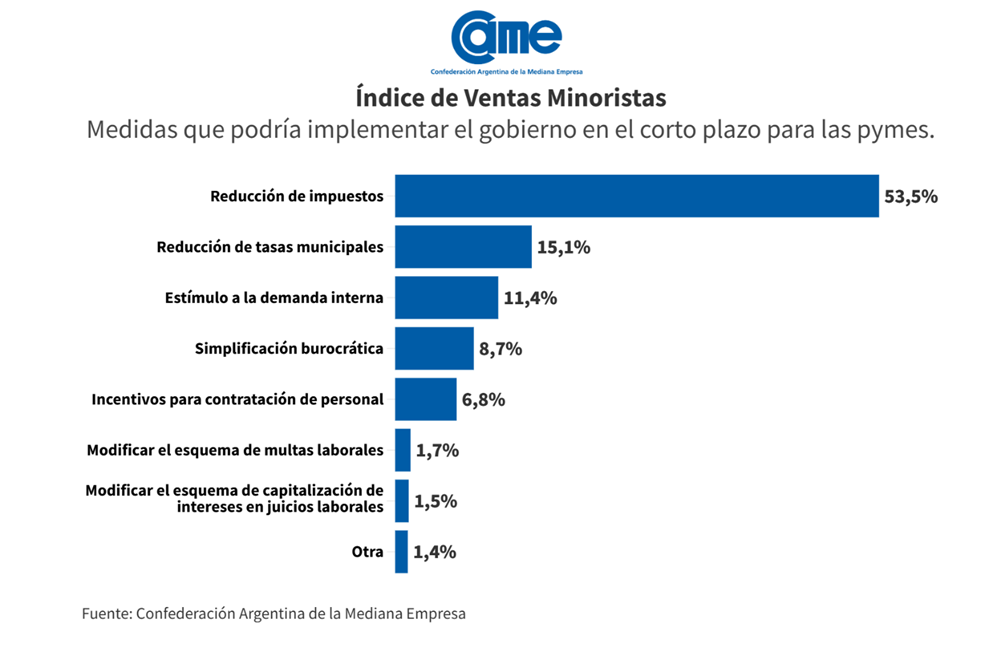 Saliendo del tema impositivo, sobresalió el reclamo de medidas que fortalezcan la demanda interna (11,4% de las respuestas) y que se generen incentivos para la contratación de personal (6,8%).