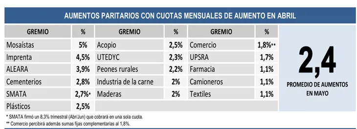 Los acuerdos salariales de los grandes gremios relevados promediaron un aumento mensual de 1,9%. A fin del primer cuatrimestre del año casi todos los grandes gremios corren por debajo de la inflación acumulada 11,6%- producto del rezago que los salarios acumulan del descalce de Marzo