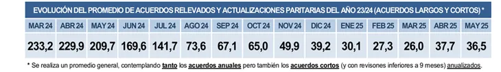 En términos anualizados, los acuerdos paritarios contemplaban en mayo subas de 36,5%, algo por debajo del mes precedente (37,7%). La tendencia decreciente que venía mostrando esta serie se interrumpió en abril, tras el repunte inflacionario de Marzo, pero de todas formas muestra una marcada reducción -en marzo de 2024 los aumentos los ajustes salariales viajaban a una velocidad de 233%-.
