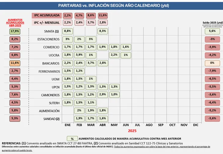 Cerrado el primer cuatrimestre del año, se observa que, a excepción de SMATA y los Bancarios, todos los grandes gremios corren por debajo de la inflación acumulada 11,6%-. Esto es producto del rezago que los salarios acumulan del descalce de marzo, que dejó a los acuerdos atrasados respecto de la velocidad de los precios.