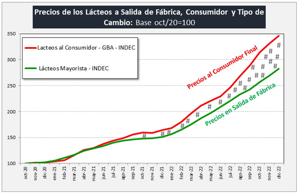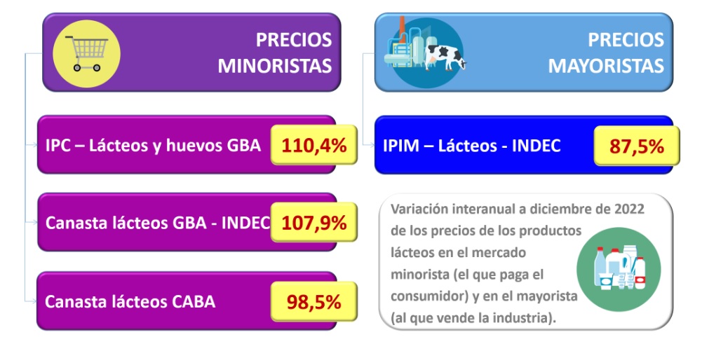 Si comparamos los precios de los lácteos del índice de precios minoristas (con datos de GBA, ya que no hay un índice lácteo minorista nacional), que presentaron a Diciembre de 2022 una suba interanual del 110,4%, vemos que los precios mayoristas de los lácteos están 20,4 puntos porcentuales por debajo. Y si lo hacemos con los precios de la Ciudad Autónoma de Bs. As., la diferencia es de 11 puntos por debajo.