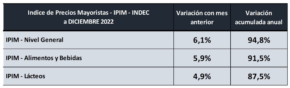 Por su parte el índice mayorista de precios de Alimentos y Bebidas registró un aumento de 5,9% en diciembre de 2022 respecto del mes anterior, y acumula una suba del 91,5% en los últimos 12 meses, destacó un reporte del Observatorio de la Cadena Láctea generado con datos del INDEC.