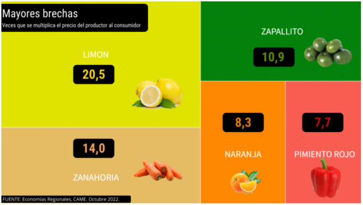 ¿Qué productos presentaron una mayor diferencia de precio en origen y destino? Según el informe, el podio lo encabezó el limón (20,5 veces), la zanahoria (14 veces), el zapallito (10,9 veces), la naranja (8.3 veces) y el pimiento rojo (7,7 veces).