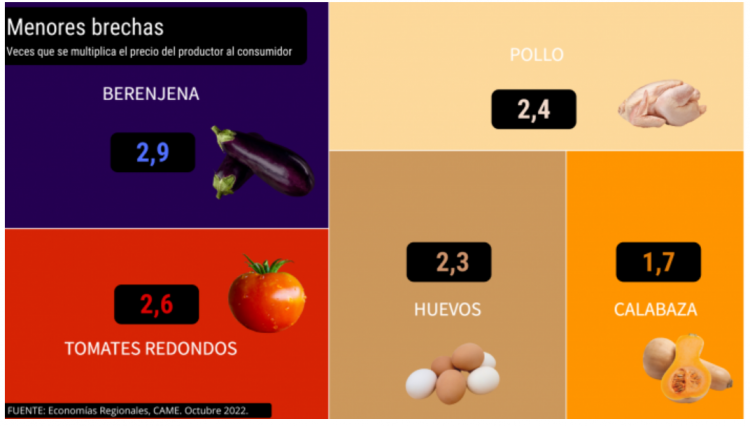 En la vereda de enfrente, los productos que presentaron menor diferencia entre el precio que recibió el productor y el que pagó el consumidor fueron la calabaza (1,7 veces), los huevos (2,3 veces), el pollo (2,4 veces), el tomate redondo (2,6 veces) y la berenjena (2,9 veces).
