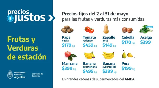 En el marco del programa Precios Justos, la Secretaría de Comercio actualizó la canasta de frutas y verduras de estación, que se encuentra disponible en las grandes cadenas de supermercados del Área Metropolitana de Buenos Aires (AMBA).