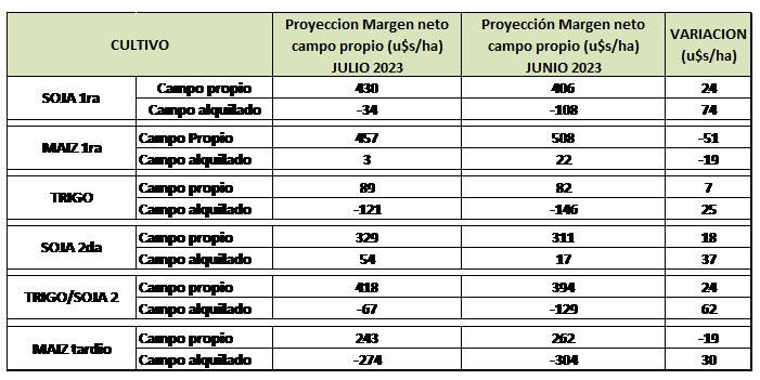 El maíz de primera fue el cultivo con el mayor descuento intermensual. La mayor caída se dio bajo la condición de campo propio con -51 U$s/ha. Contrariamente, la soja de primera en campo alquilado fue la que presentó el mayor aumento en la rentabilidad, con una mejora de 74 U$s/ha en campo alquilado y 24 u$s/ha en campo propio. Sin embargo, los márgenes siguen mostrando valores negativos teniendo en cuenta el nivel de productividad planteado (40 qq/ha) y el esquema de costo analizado.