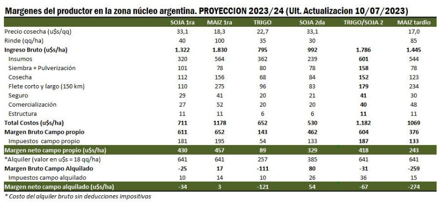 Con los precios actualizados, desde la Bolsa rosarina señalan que los márgenes calculados siguen arrojando los mejores números para el maíz de primera en campo propio con 457 u$s/ha. Sin embargo, la soja de primera le sigue muy de cerca con 430 U$s/ha.