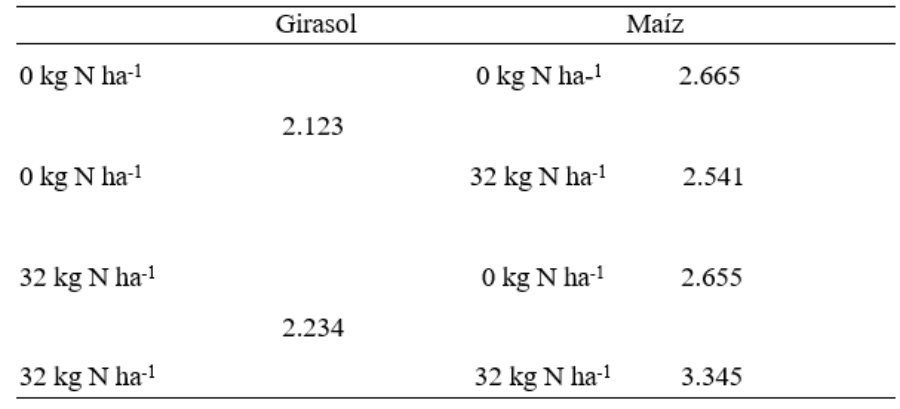 32 kg N ha-1 en girasol y 0 N kg ha-1 en maíz